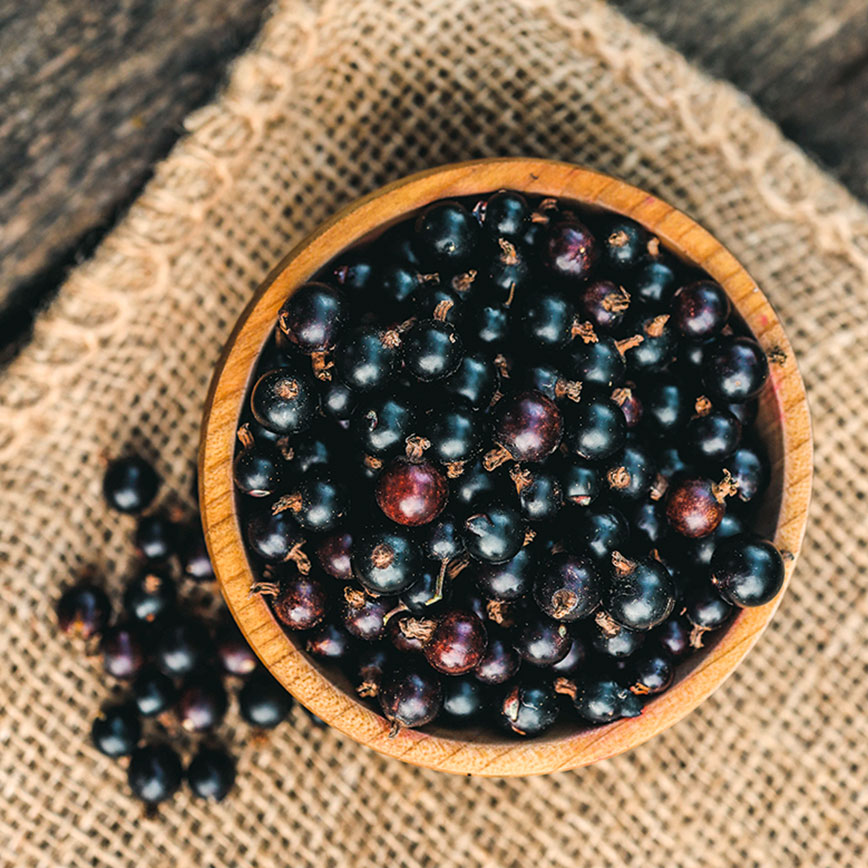 Die Black Currant macht sich als Superfood zunehmend einen Namen. Und das ganz zu Recht. Denn ernährungsphysiologisch ist die Beere vor allem aufgrund von zwei Dingen interessant: Vitamin C und Polyphenole. Vitamin C ist der klassische Allrounder in der Ernährung. Es trägt etwa zur Funktion unseres Immunsystems bei und schützt die Zellen vor oxidativem Stress. Wunderbar, davon können wir doch kaum genug bekommen! Mit den schwarzen Kleinen kein Problem: Pro 100 Gramm bringen sie es auf 170 bis 180 Milligramm Vitamin C und stecken Zitrone, Orange und Co. dabei locker in die Tasche. Auch ihre roten und weissen Verwandten schlagen sie beim Vitamin-C-Gehalt um Längen. Zur Einordnung: Der empfohlene Tagesbedarf an Vitamin C eines durchschnittlichen Erwachsenen liegt bei ungefähr 100 Milligramm und liesse sich mit rund 60 Gramm Black Currant decken. Doch das ist noch nicht alles, was in den leckeren Beeren steckt. Die schwarzen Perlen der Natur tragen auch viele Ballaststoffe und wertvolle Mineralstoffe unter der Haut. Der Gehalt an Eisen und Kalium beispielsweise ist bemerkenswert. Zudem enthalten sie Polyphenole, darunter Anthocyane. Sie verleihen den Beeren ihre typische blauschwarze Farbe und sammeln sich in der Schale. Den Anthocyanen wird eine antioxidative und entzündungshemmende Wirkung nachgesagt.