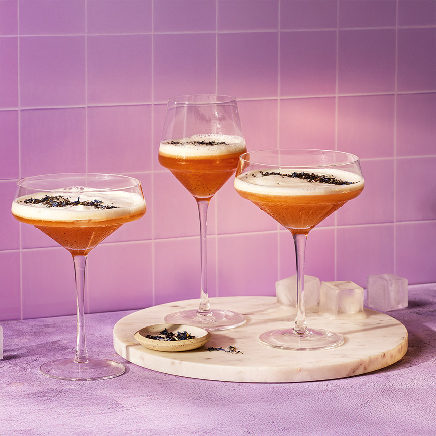 3. Anrichten: Cocktail durch ein feines Sieb ins Glas giessen, mit wenig Tee dekorieren.