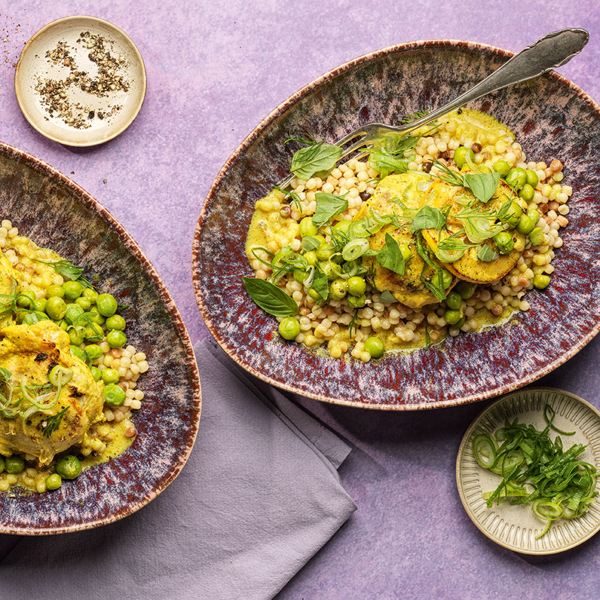 180 g Jogurt nature • 2 Knoblauchzehen, gepresst • 2 EL Zitronensaft • ½ TL Kurkuma • ¼ TL Kreuzkümmelpulver • 1 TL Salz • 500 g Poulet-Steaks ohne Haut • 1 EL Olivenöl • ½ Bio-Zitrone, in dünnen Scheiben • 2 dl Hühnerbouillon • 250 g tiefgekühlte Erbsli, aufgetaut • ½ EL Weissmehl • 4 Zweiglein Dill, zerzupft • 4 Zweiglein Basilikum, Blätter abgezupft • 1 Bundzwiebel mit dem Grün, in feinen Ringen