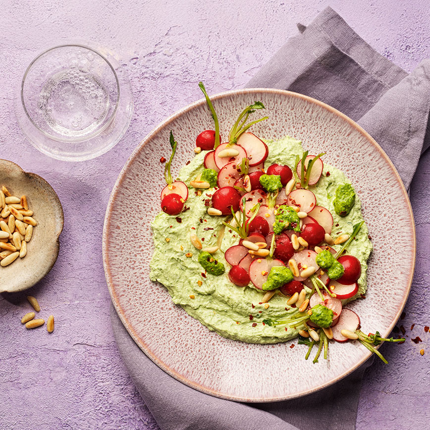 1 Bund Bärlauch (ca. 20 g), grob geschnitten • 2 EL Olivenöl • 2 EL Wasser • 1 Prise Salz • 125 g Bio-Frischkäse nature • 1 Bund Radiesli, in ca. 4 mm dicke Scheiben gehobelt • 1 TL flüssiger Honig • 1 TL Essig • ¼ TL Chiliflocken • ¼ TL Salz • 1 EL Pinienkerne, geröstet