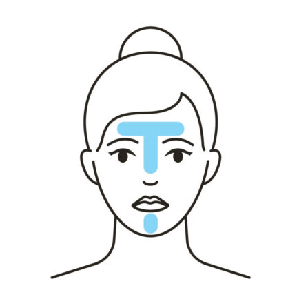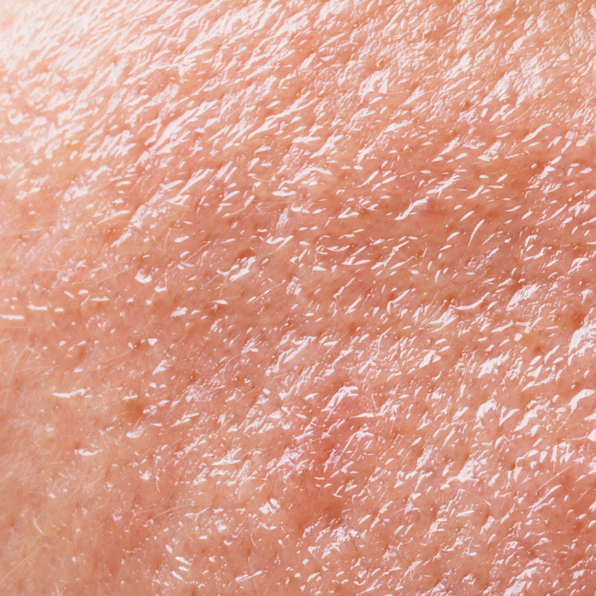 Die Talgdrüsen produzieren zu viel Sebum, was zu einem öligen Hautbild v. a. in der T-Zone (Stirn, Nase, Kinn) führt. Neigt zu Mitessern und Akne. Ursachen: genetische Veranlagung, hormonelle Veränderungen (Pubertät, Schwangerschaft), Stress, Kosmetika, Medikamente.